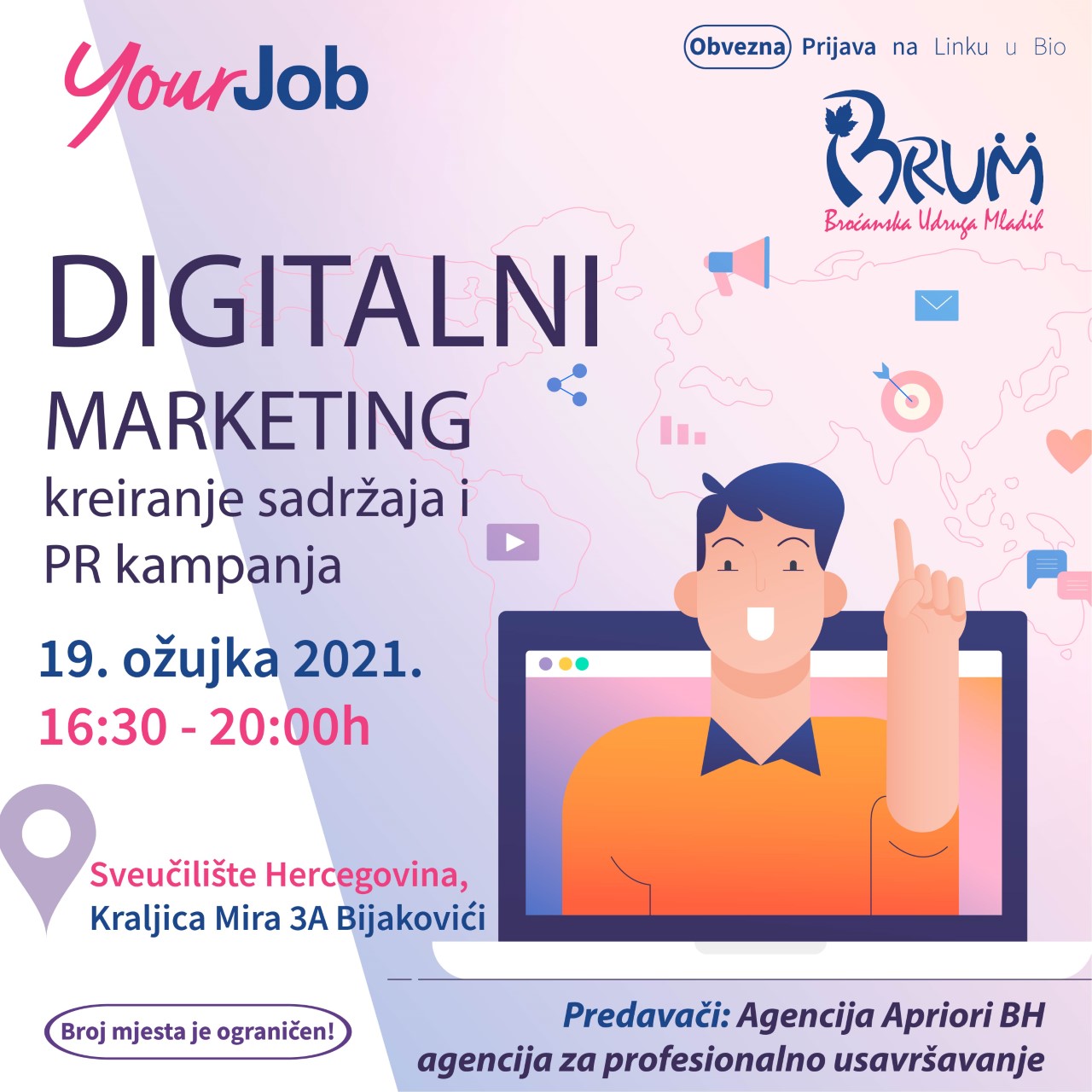 YourJob BiH organizira obuku na temu: “Digitalni marketing, kreiranje sadržaja i kampanja” u suradnji s udrugom BRUM.